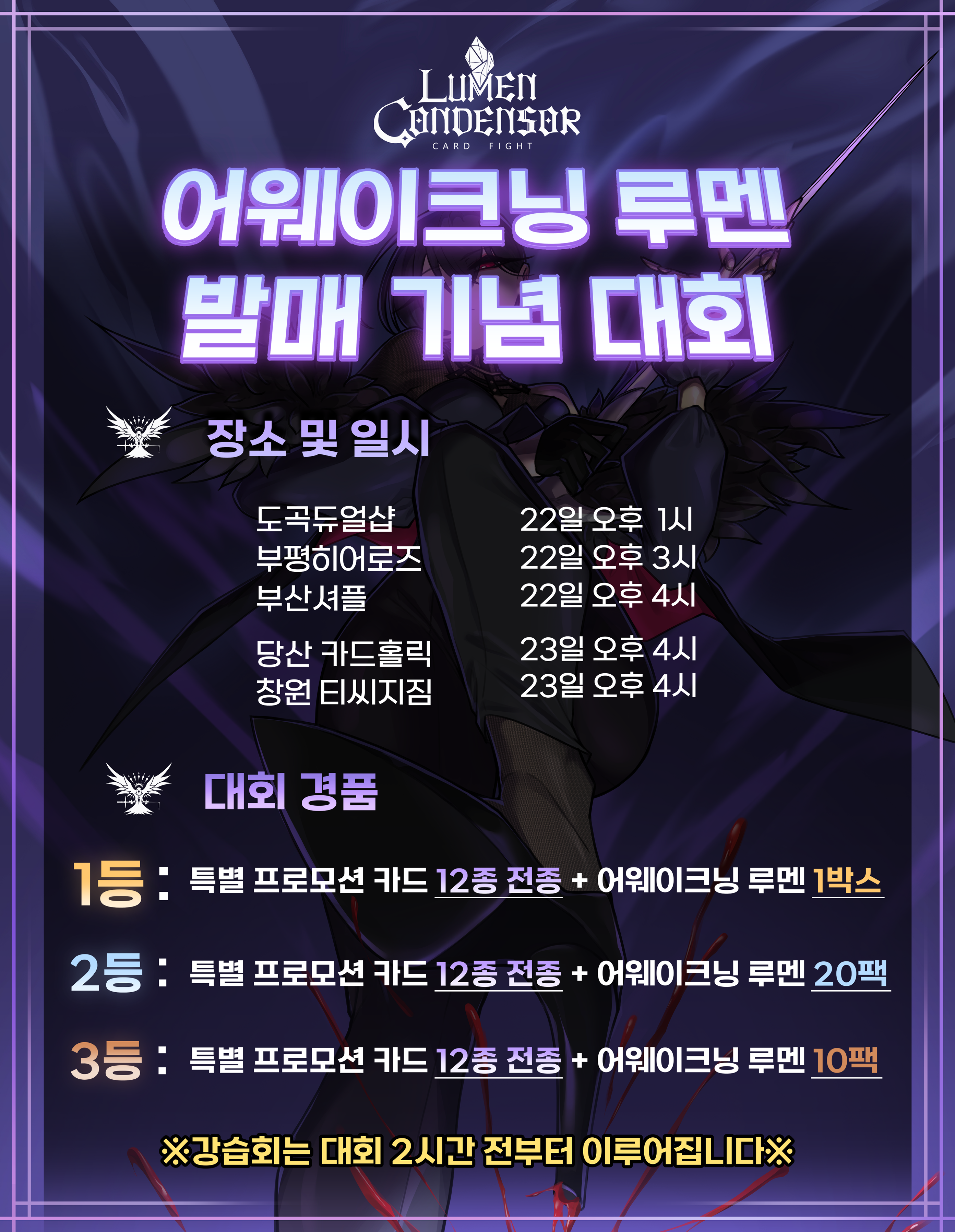 이번 '루멘콘덴서' 공인대회 이벤트는 1차 확장팩인 '어웨이크닝 루멘' 발매 기념으로 전국적으로 진행되는 이벤트입니다.