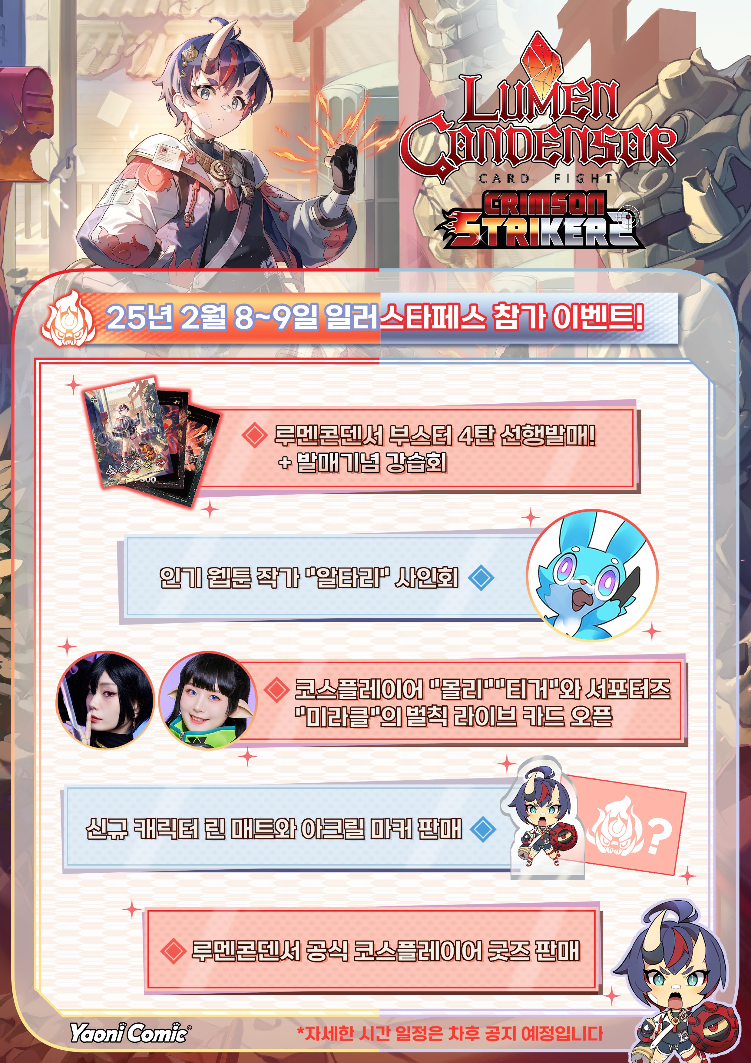 한편, 오는 2025년 2월 8일부터 9일까지 일산 킨텍스에서 진행되는 ILLUSTAR FES 6 (일러스타 페스 6)에 참여하여 '루멘콘덴서' 4번째 확장 부스터팩 ‘크림슨 스트라이커즈’ 선행발매 이벤트를 진행한다. 자세한 정보는 공식 SNS와 디스코드를 통해서 확인 할 수 있다.