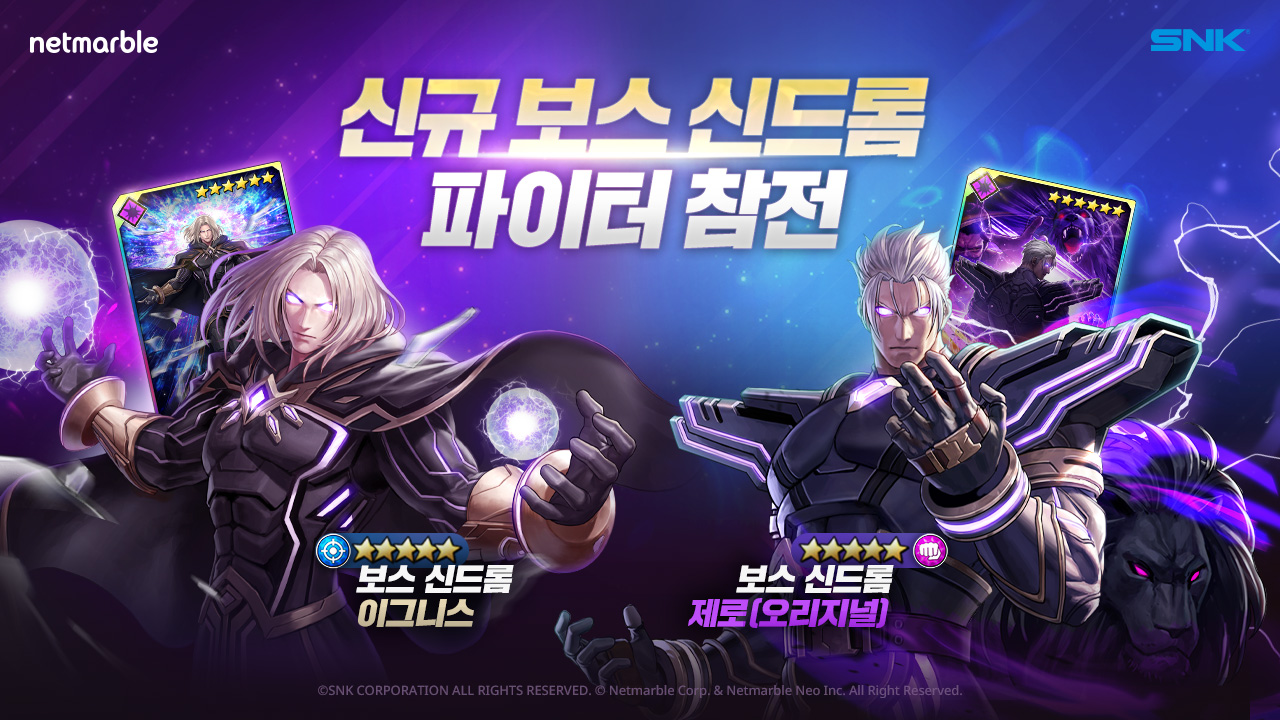 넷마블(대표 권영식, 이승원) 은 액션 RPG ‘더 킹 오브 파이터즈 올스타(이하 킹 오브 파이터 올스타)’ 에 신규 보스 신드롬 파이터 2종을 추가하는 등 업데이트를 실시했다고 29일 밝혔다.