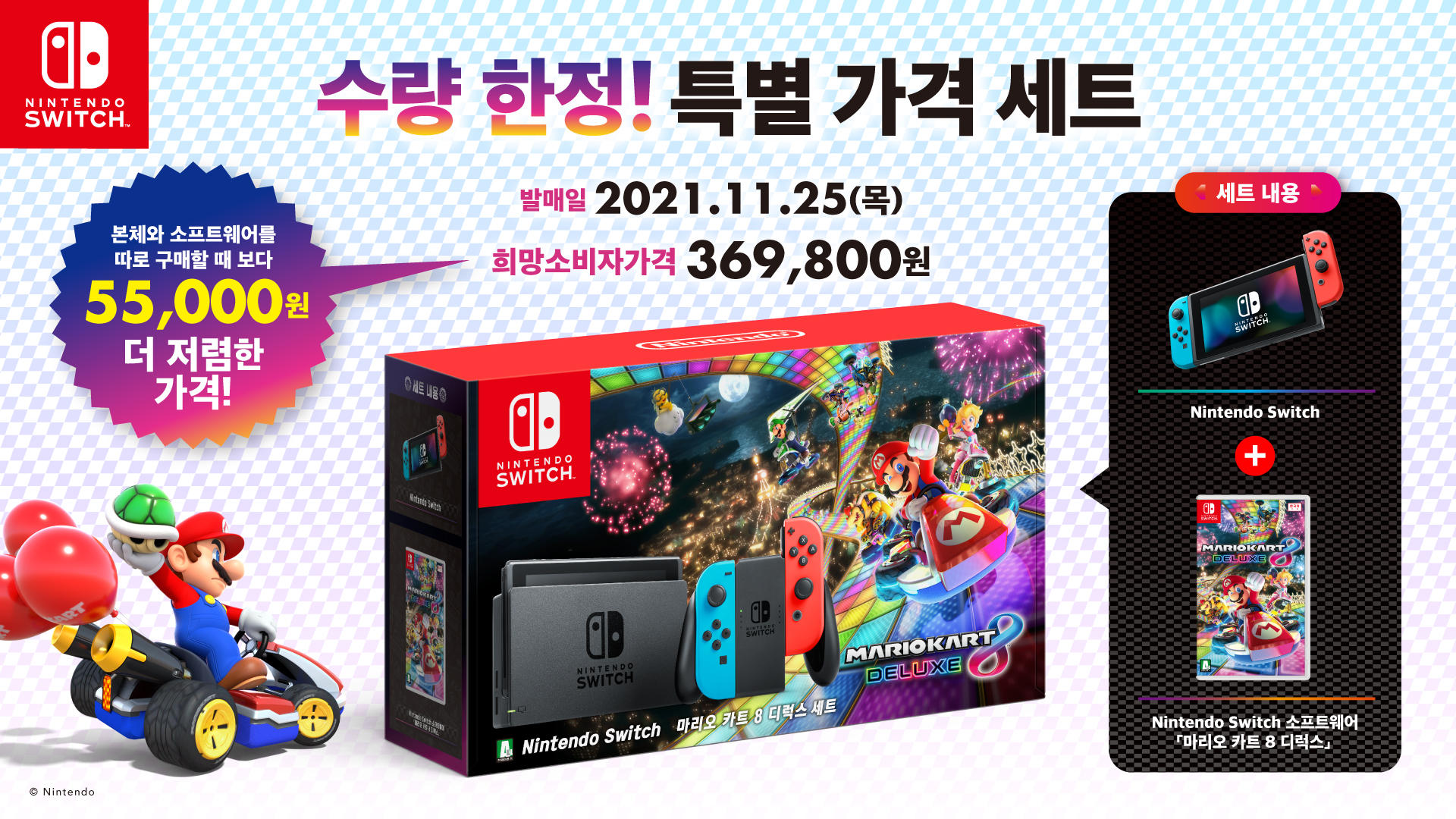 'Nintendo Switch 마리오 카트 8 디럭스 세트' 에는 네온 블루/네온 레드 컬러의 Nintendo Switch 본체와 "마리오 카트 8 디럭스" 패키지 버전이 함께 들어 있다. 본체와 소프트웨어를 별도로 구입할 때 보다 55,000원 더 저렴한 가격으로 만날 수 있다.