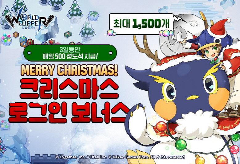 모바일 액션 RPG ‘월드 플리퍼’에서는 오는 24일부터 26일까지 게임에 접속한 이용자 전원에게 총 1,500개의 재화 ‘성도석’ 을 선물하는 ‘크리스마스 로그인 보너스’ 이벤트를 실시한다.