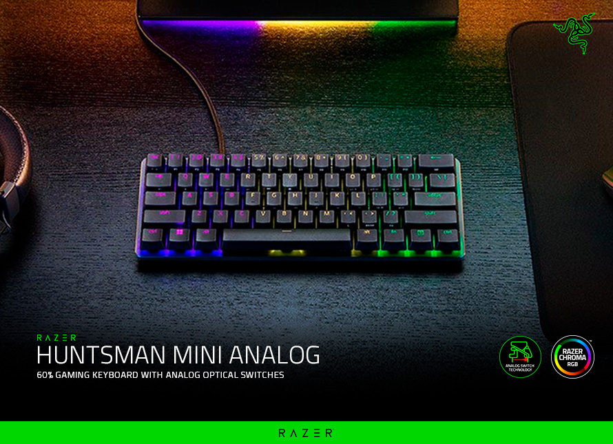 이번에 출시하는 RAZER HUNTSMAN MINI ANALOG 는 표준 키보드 60% 크기의 휴대용 폼팩터 키보드로 게이머에게 탁월한 수준의 정확성, 성능, 컨트롤을 제공하는 Razer 의 독점 아날로그 광학 스위치를 탑재했다.