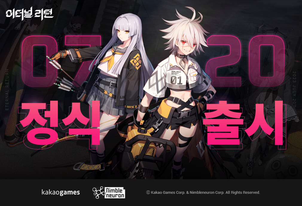 ㈜카카오게임즈(대표 조계현) 는 19일, 넵튠의 자회사 ㈜님블뉴런(대표 김승후) 이 개발하고 자사가 공동 서비스하는 PC 온라인 생존 배틀 아레나 ‘이터널 리턴’ 이 7월 20일 정식 서비스를 시작한다고 밝혔다.