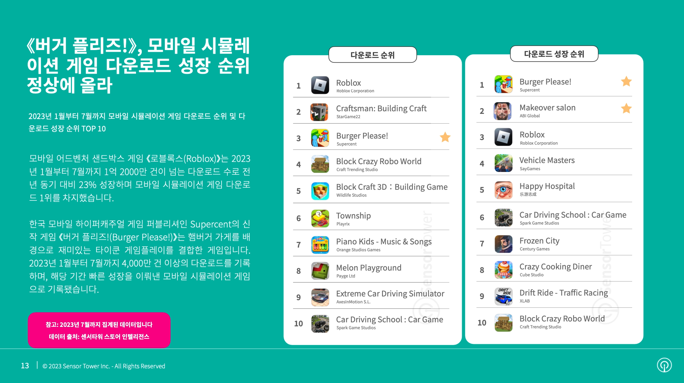 2023년 1월부터 7월까지 모바일 시뮬레이션 게임 다운로드 및 다운로드 성장 순위에서는 Roblox Corporation이 출시한 ‘로블록스’ 와 국내 모바일 하이퍼캐주얼 게임 퍼블리셔인 슈퍼센트(Supercent) 가 출시한 신작 ‘버거 플리즈!(Burger Please!)’ 의 성과가 눈에 띄었다.
