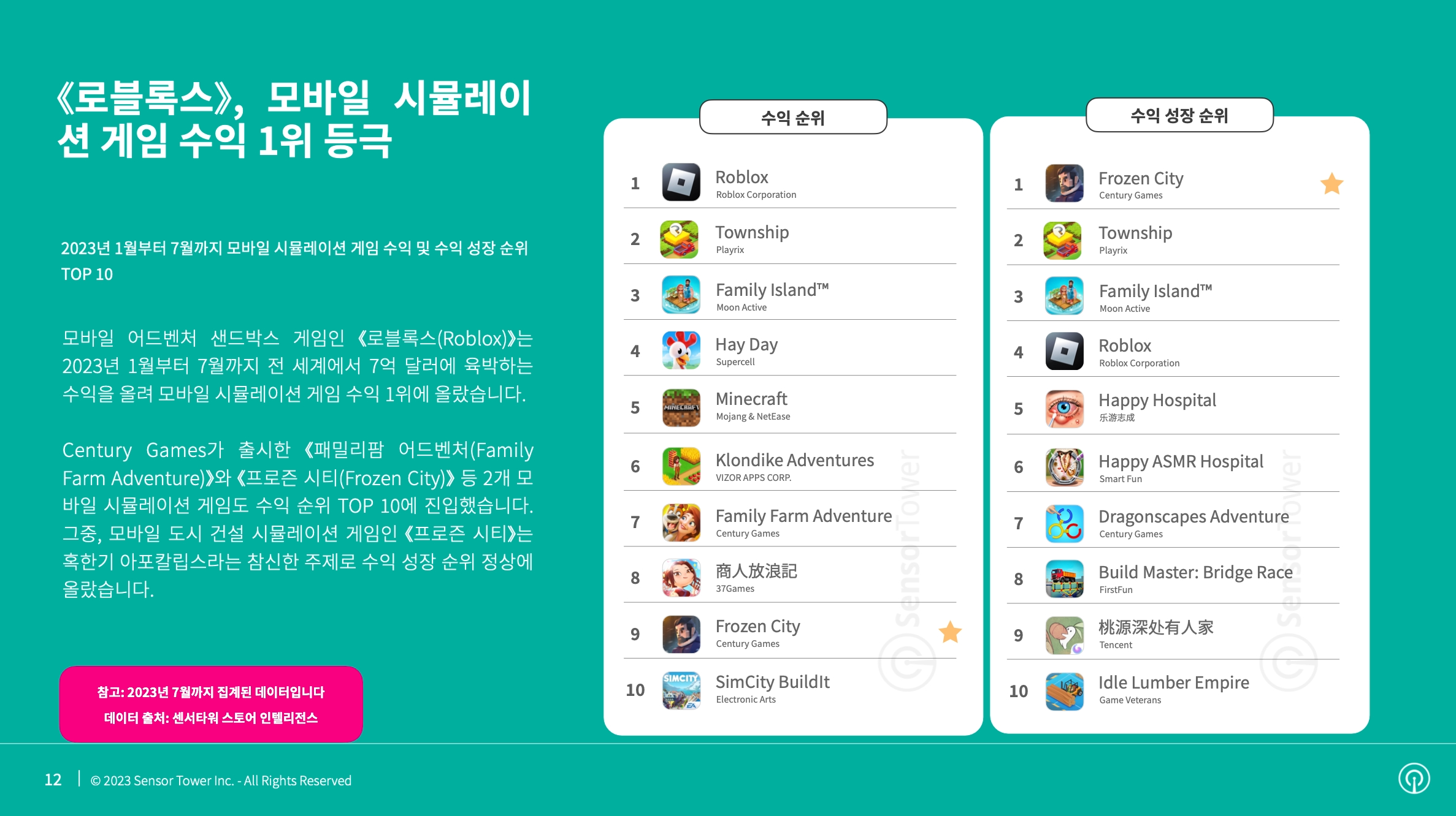 Century Games가 출시한 ‘패밀리팜 어드벤처(Family Farm Adventure)’와 ‘프로즌 시티(Frozen City)’ 등 2개 모바일 시뮬레이션 게임도 수익 순위 TOP 10에 진입했다. 그중 모바일 도시 건설 시뮬레이션 게임인 ‘프로즌 시티’는 혹한기 아포칼립스라는 참신한 주제로 수익 성장 순위에서 정상을 차지했다.