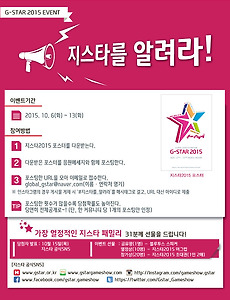 G-STAR 전시 개요전시명 : 국제게임전시회 지스타 2015 (Game Show & Trade, All-Round)기 간 : 2015.11.12(목) ~ 11.15(일), 4일간 (10:00 ~ 18:00, 개막일 입장 12:00~) ※ BTB 2015.11.12(목) ~ 11.14(토), 3일간 (10:00 ~ 18:00) 장 소 : 부산 BEXCO규 모 : 54,100㎡ 주 최 : 한국인터넷디지털엔터테인먼트협회주 관 : 부산정보산업진흥원, 지스타조직위원회개최도시 : 부산광역시요금안내 :전시회 : 학생 4,000원 / 성인 8,000원컨퍼런스 : 학생 30,000원 / 성인 50,000원 공식홈페이지: http://www.gstar.or.kr/boad/bd_news/2/egoread.asp?bd=2&..